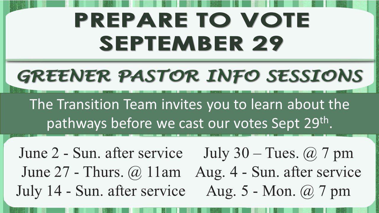 The Transition Team invites you to a Greener Pastor Info Session. We're offering six, so choose the one that fits your schedule best. You will vote on September 29 for the path you think Grace should pursue. That gives you lots of time for prayer and consideration. Come and explore our options on one of these dates